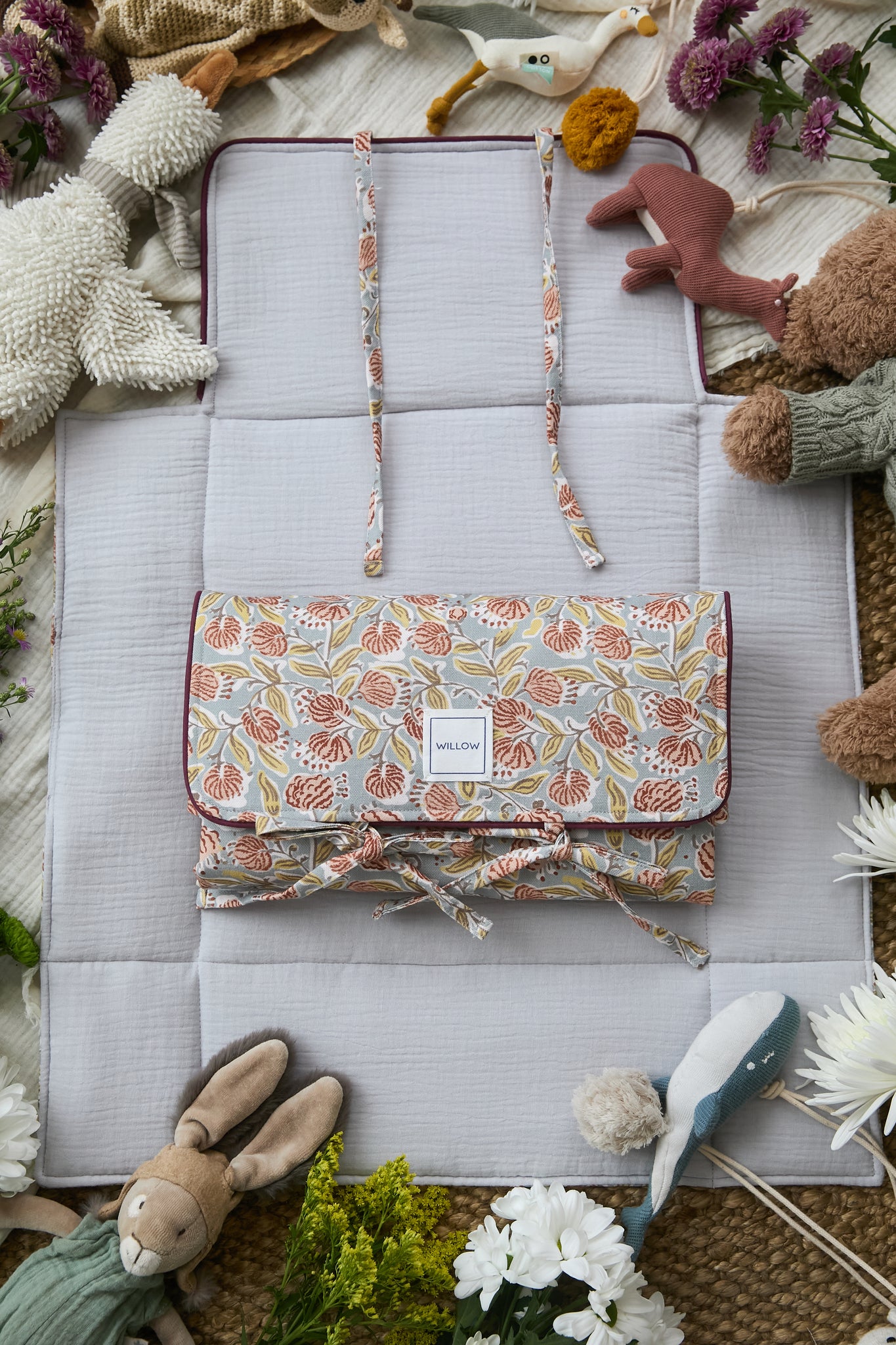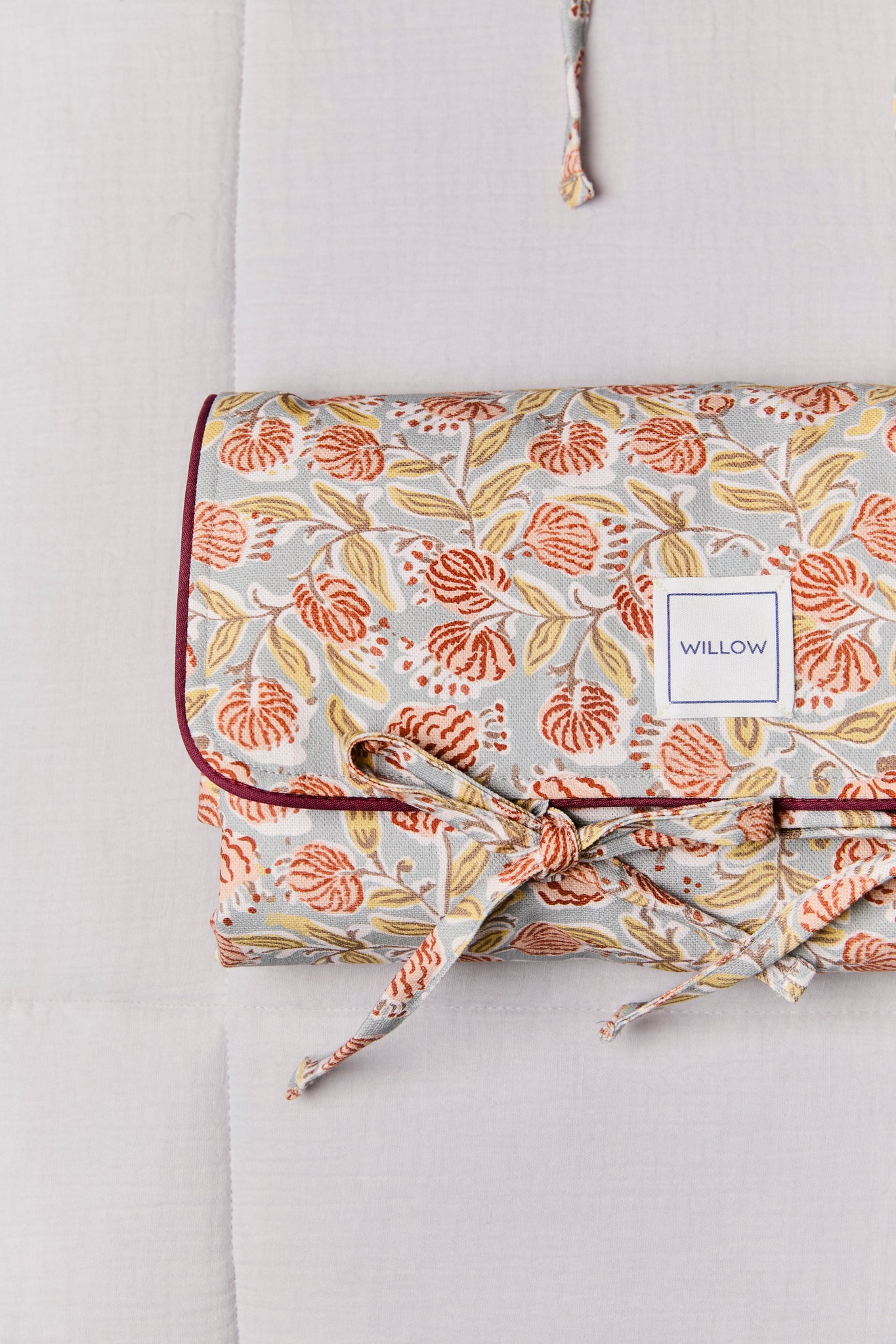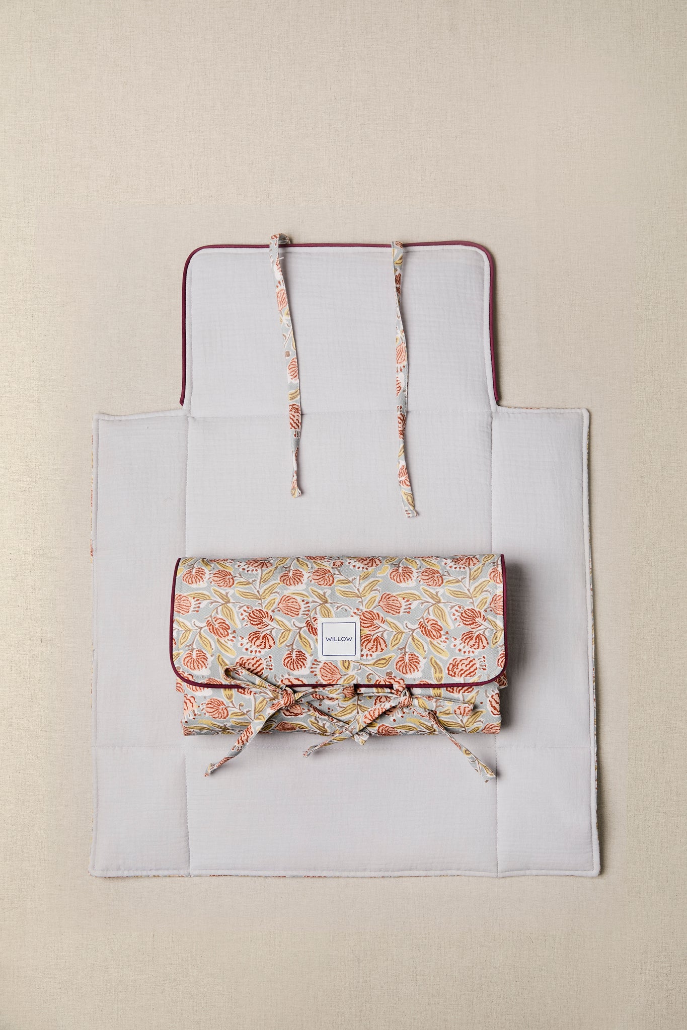 Cambiador de viaje fabricado con tejido 100% algodón en el exterior y bambula orgánica en el interior. Con una capa intermedia impermeable.