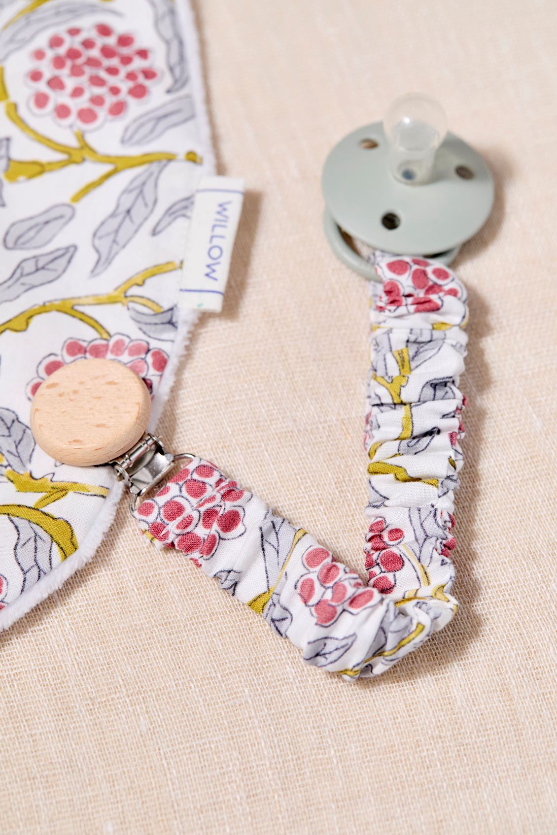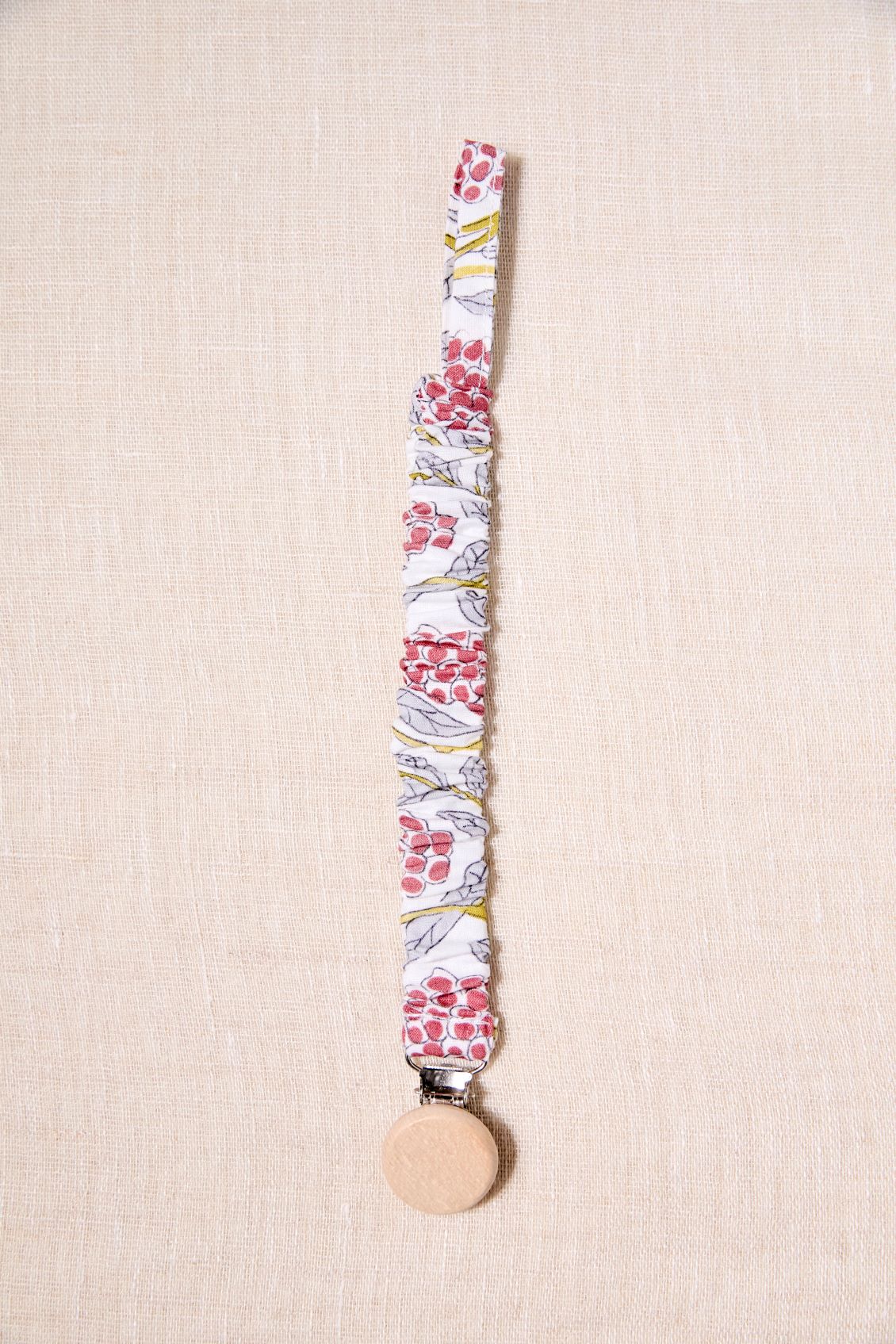 Chupetero con goma muy práctico y facil de colocar gracias a la pinza a presión con la que se enganchan. Cuenta con una tira de algodón de la misma tela que el chupetero para enganchar el chupete.