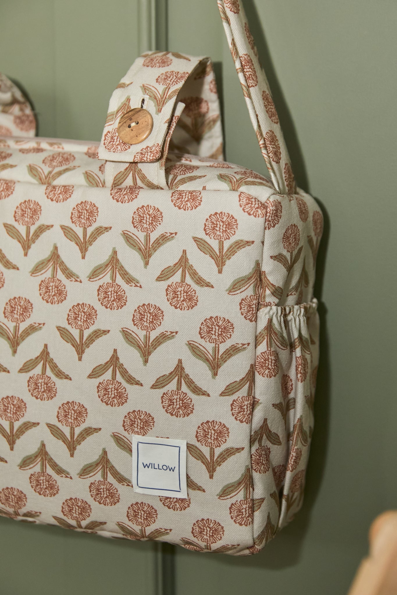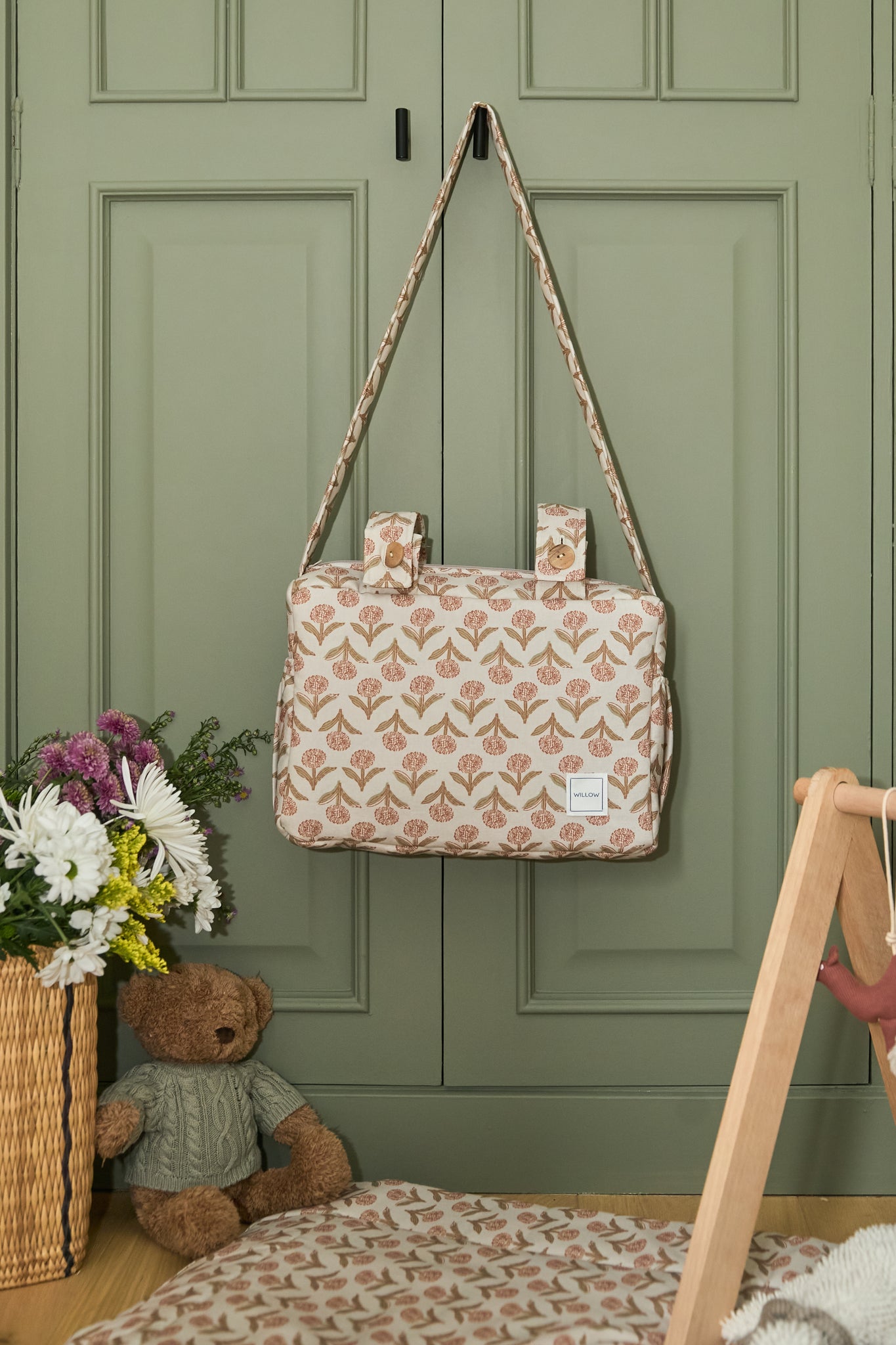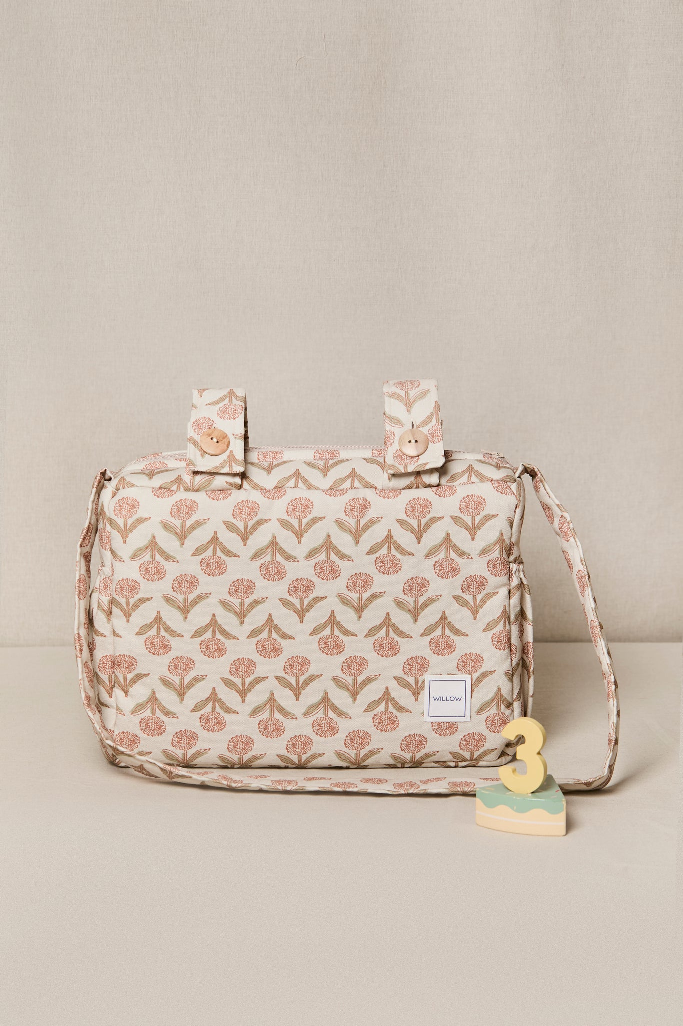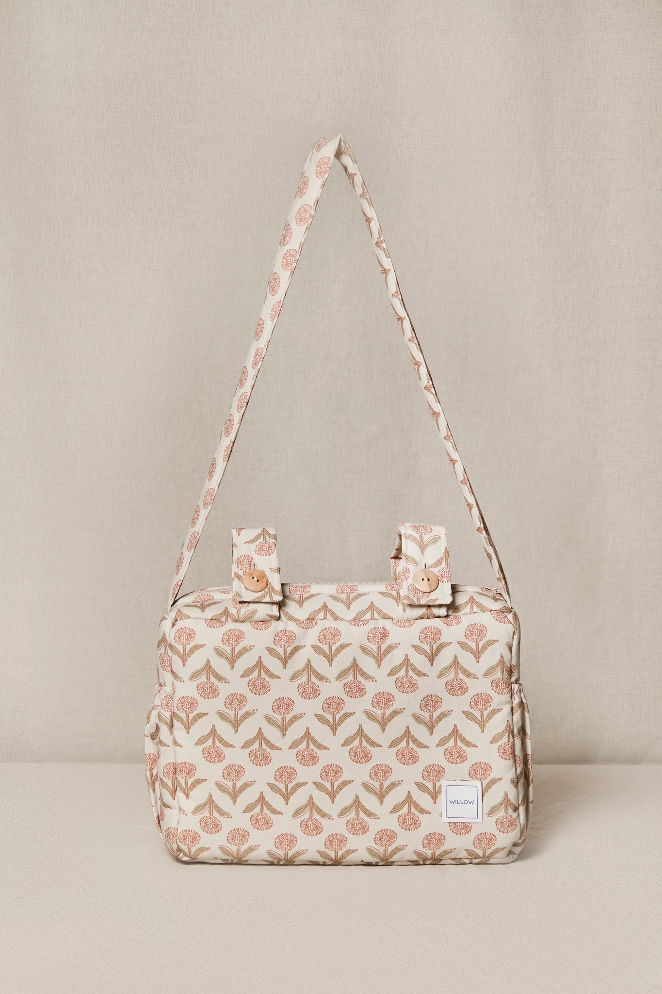 Se ajusta con botones al cochecito. Además cuenta con una cómoda bandolera para que puedas llevar el bolso al hombro a todas partes.