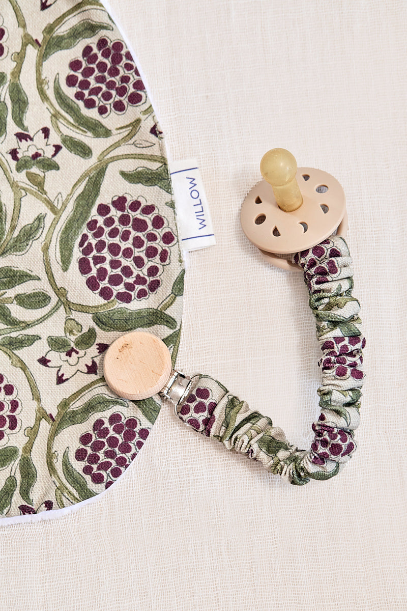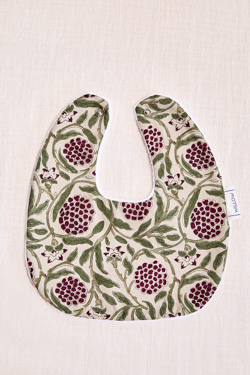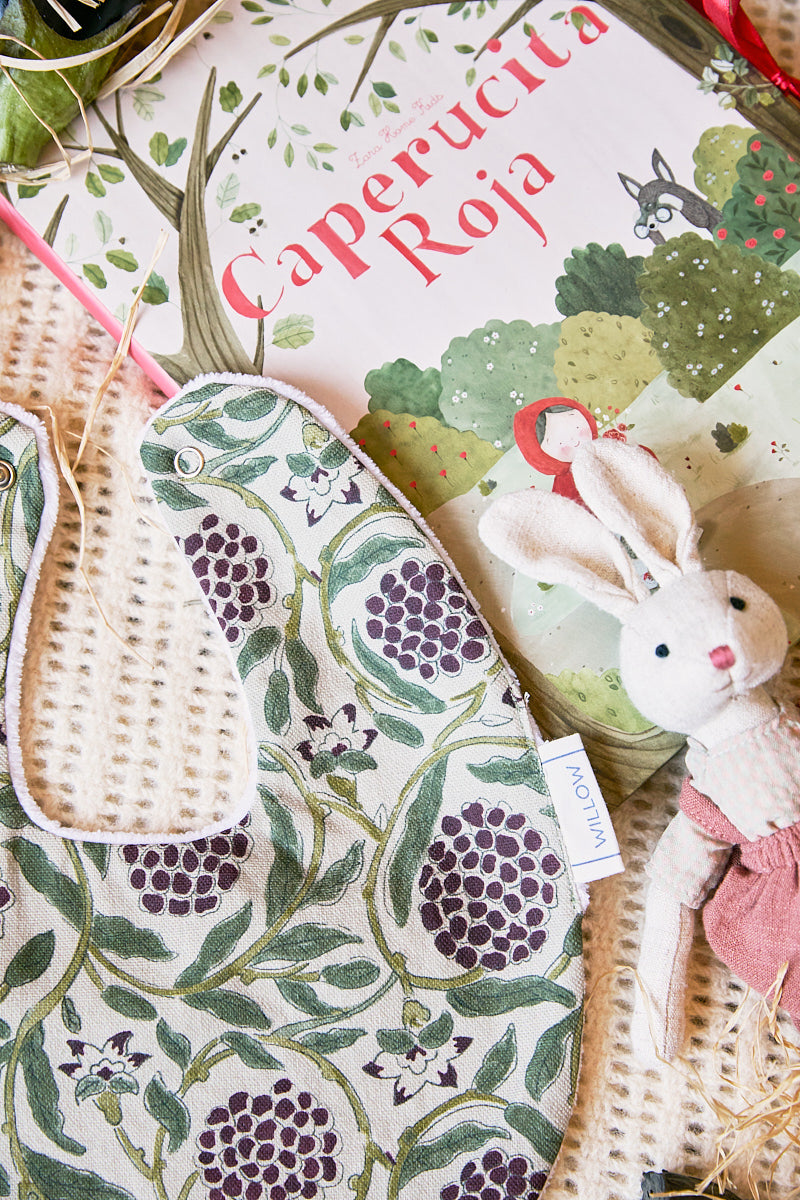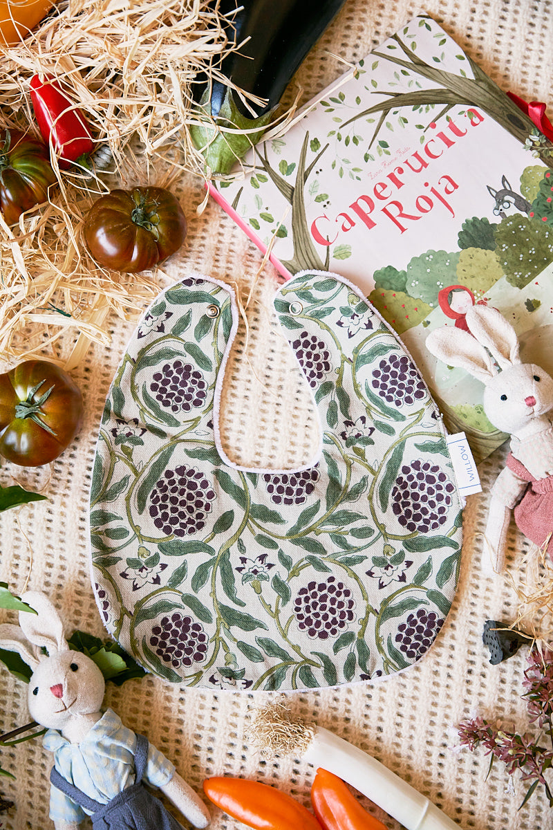 Babero impermeable fabricado en algodón 100% y rizo de toalla, con una capa intermedia impermeable que evita que traspasen los líquidos. Se cierra con un botón de snap.
