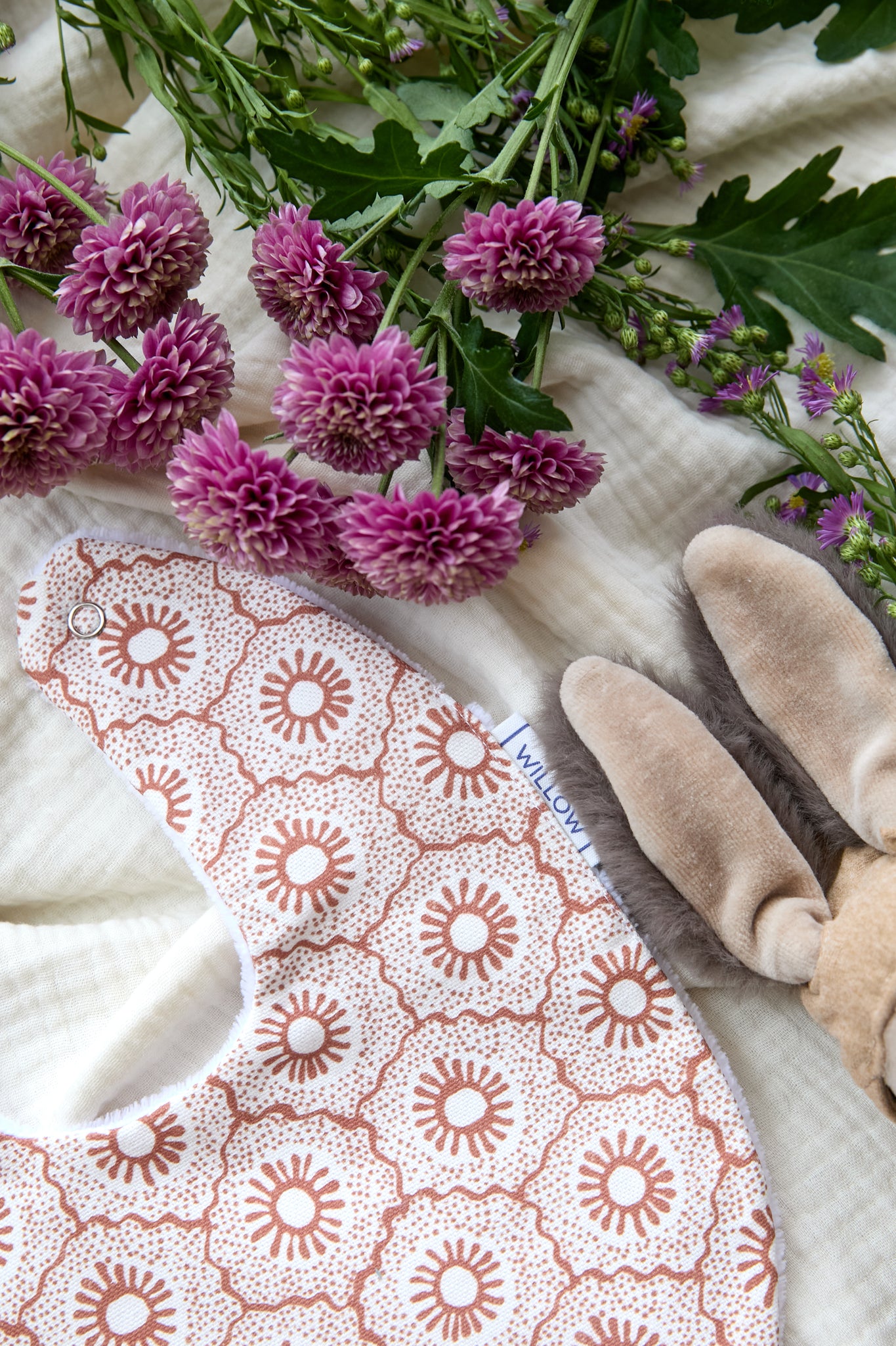 Babero impermeable fabricado en algodón 100% y rizo de toalla, con una capa intermedia impermeable que evita que traspasen los líquidos. Se cierra con un botón de snap.