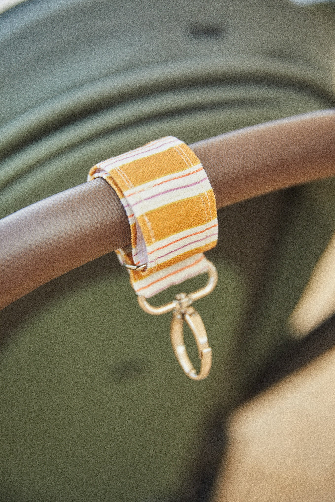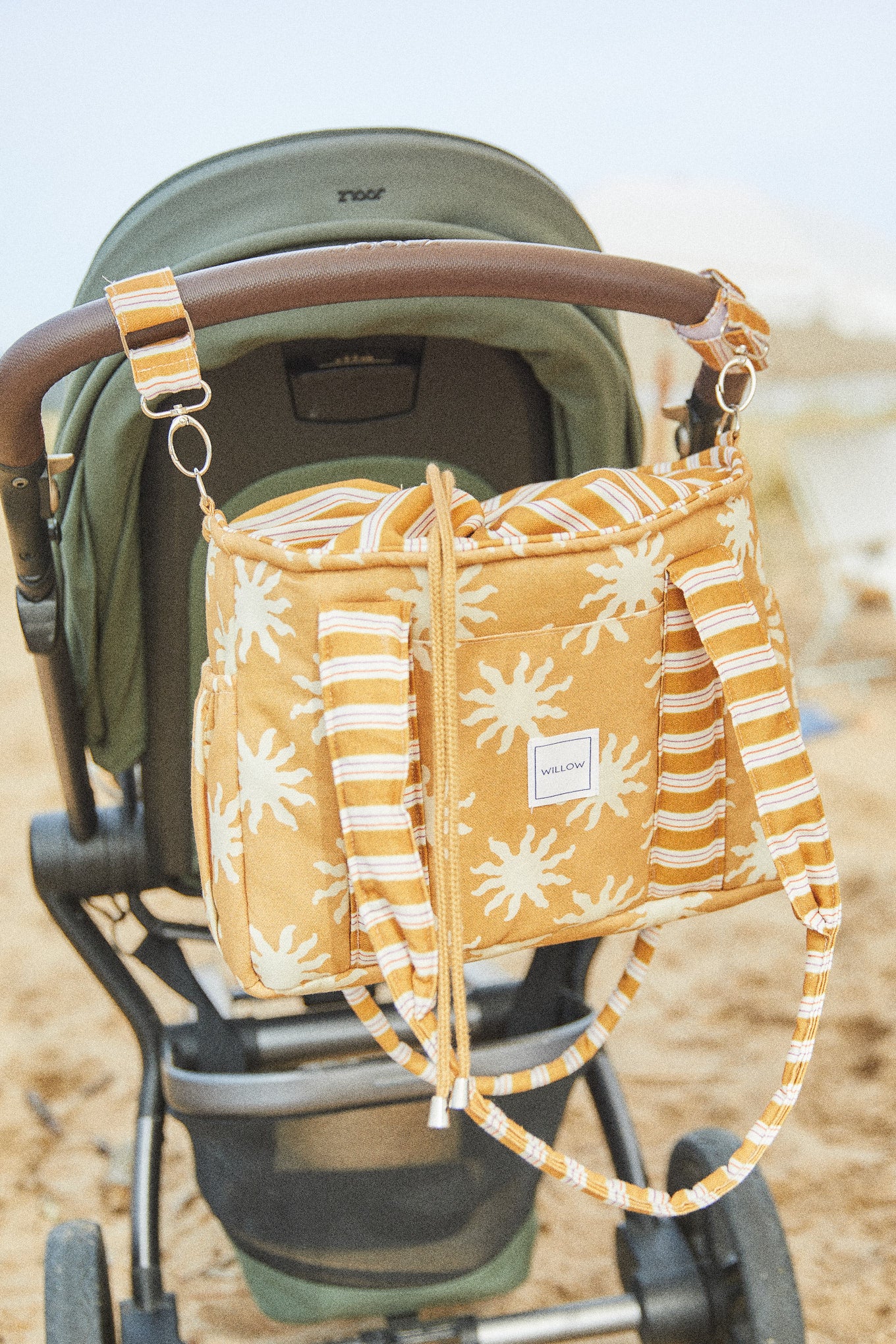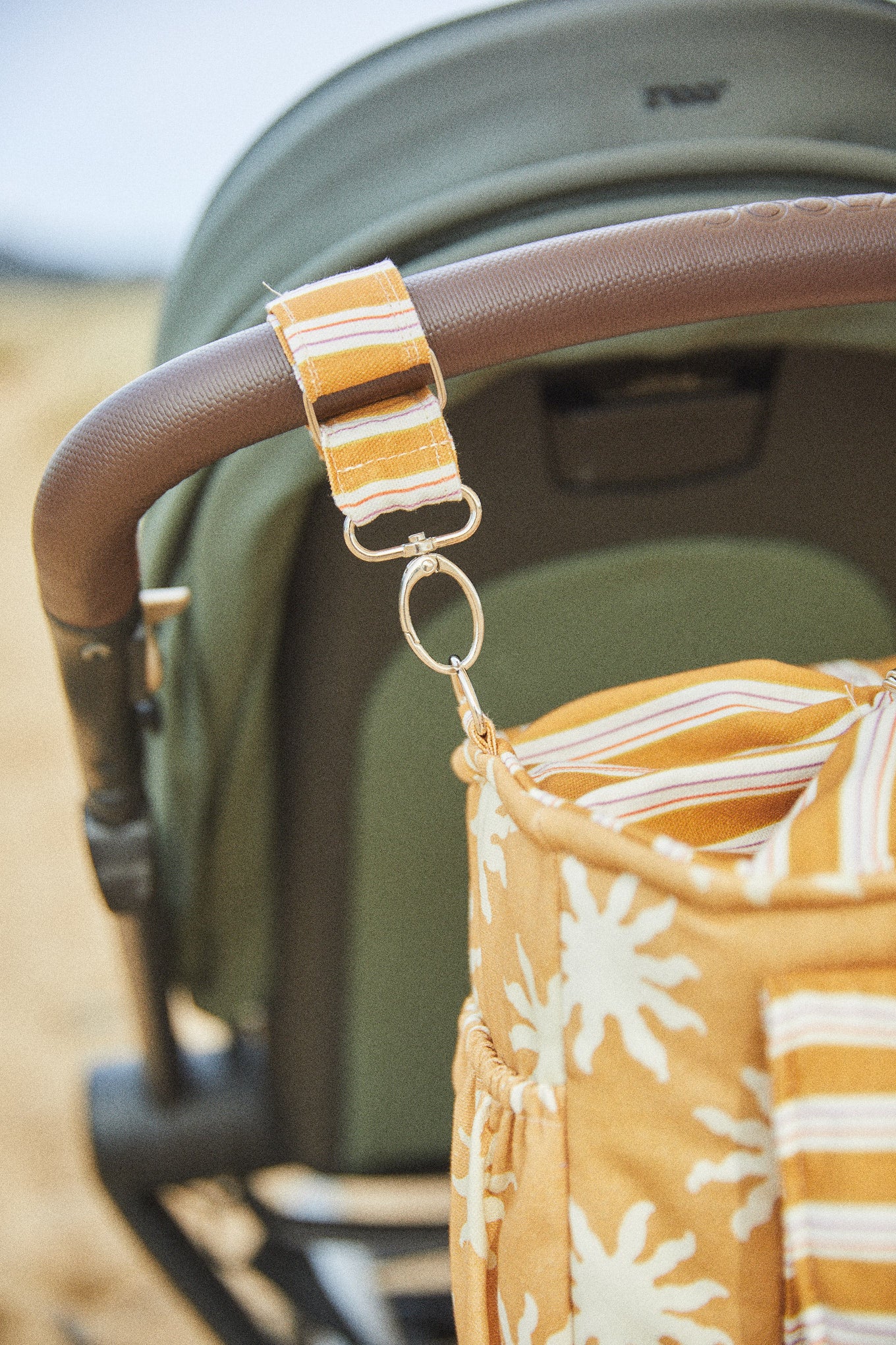 Se fija al manillar mediante cintas con mosquetones, un sistema práctico que permite colocar y retirar el bolso con facilidad. Las cintas permanecen sujetas al lateral del manillar del carrito, protegiendo así las cintas del bolso del desgaste y evitando el roce continuo. Con un gesto sencillo podrás desabrochar el bolso y llevarlo cómodamente a todas partes.
