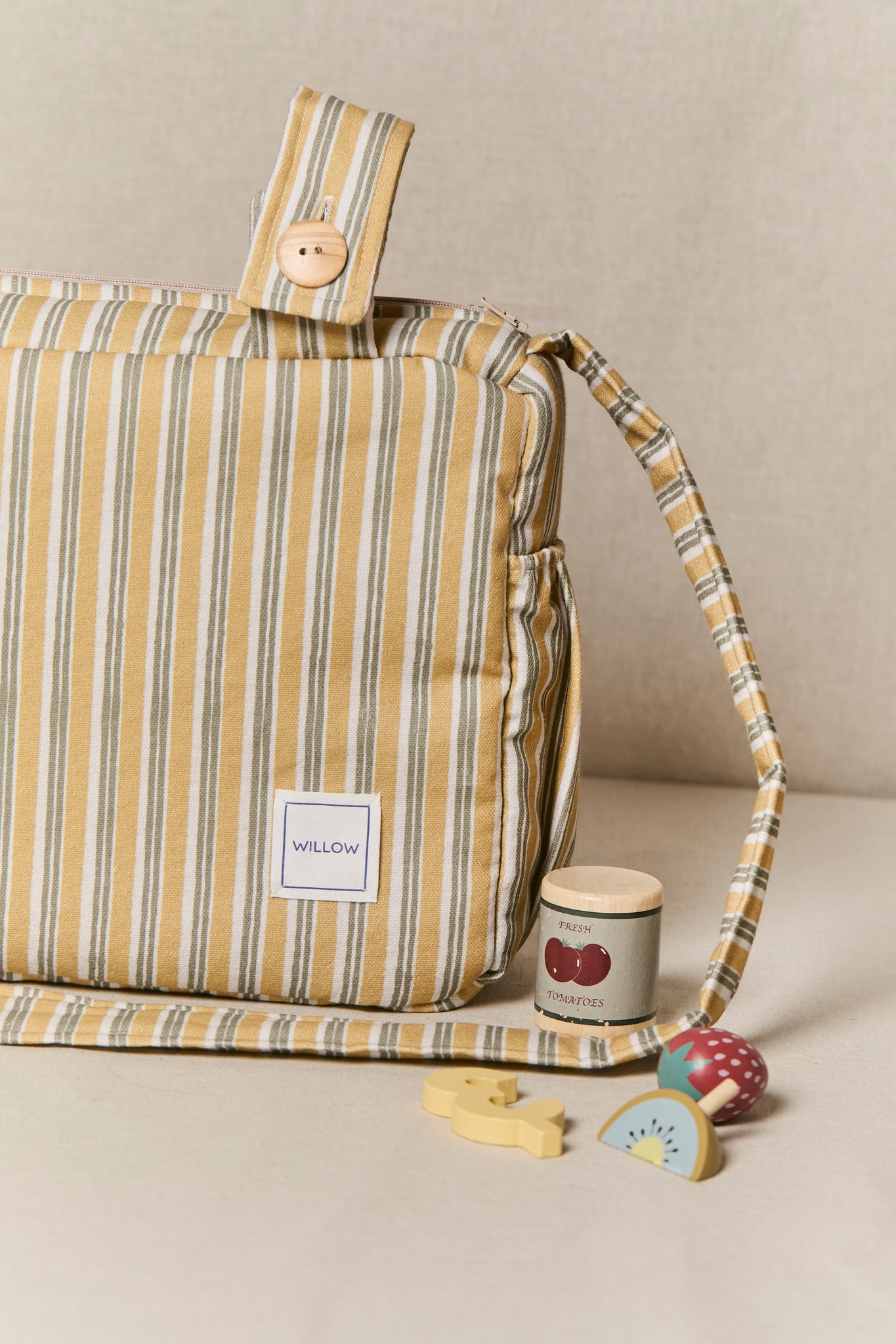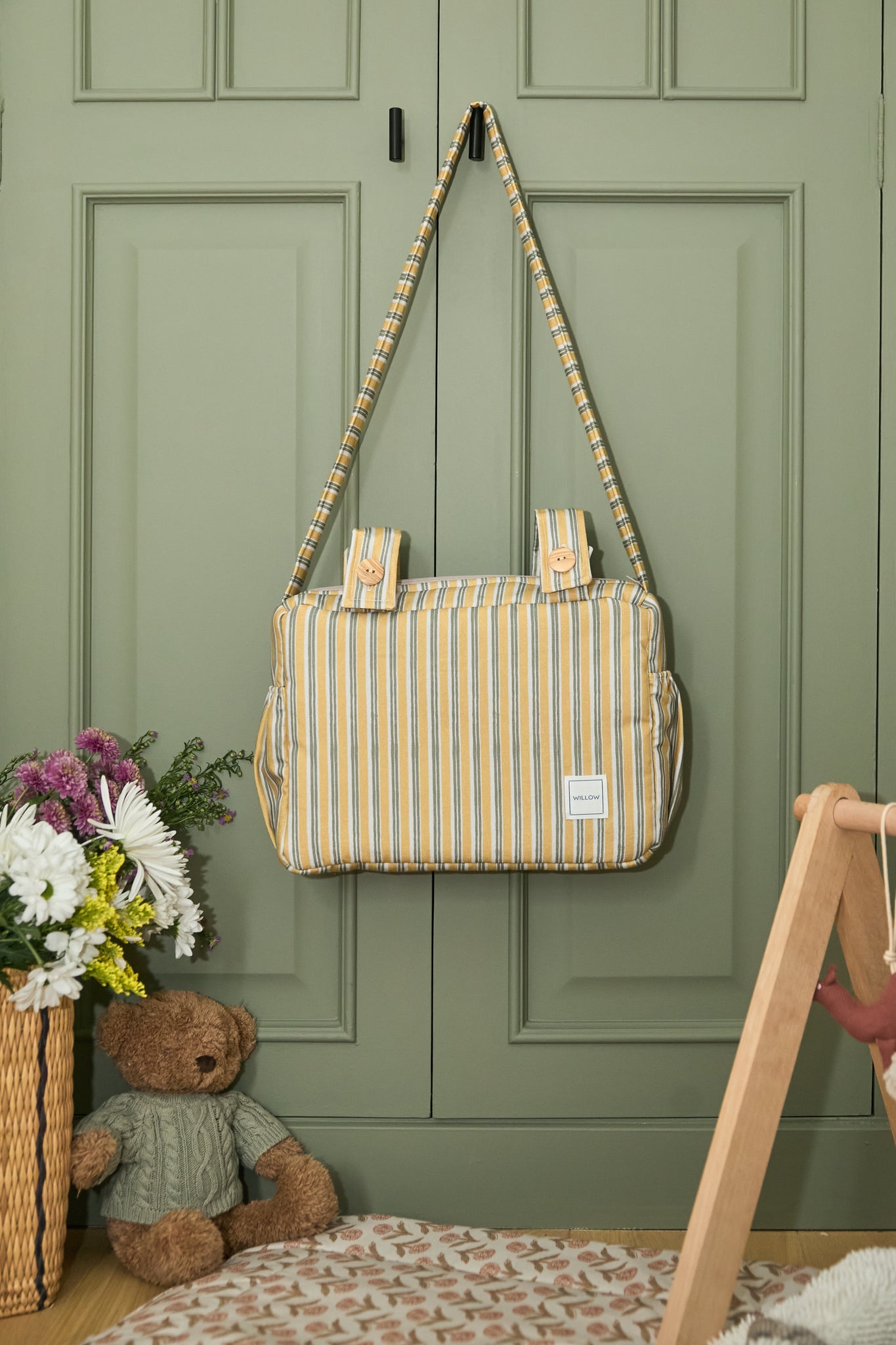 Se ajusta con botones al cochecito. Además cuenta con una cómoda bandolera para que puedas llevar el bolso al hombro a todas partes.