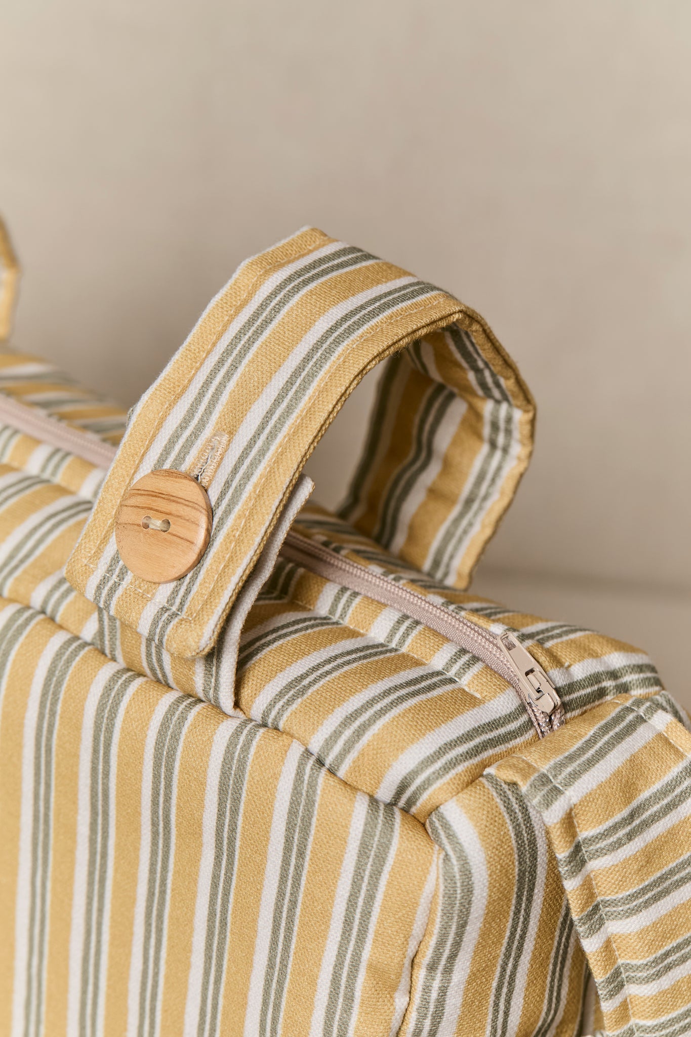 Se cierra con cremallera para evitar que el interior esté visible. Interior de loneta beige de rayas, material muy resistente y de fácil lavado. Bolsillos interiores a juego con la tela exterior.
