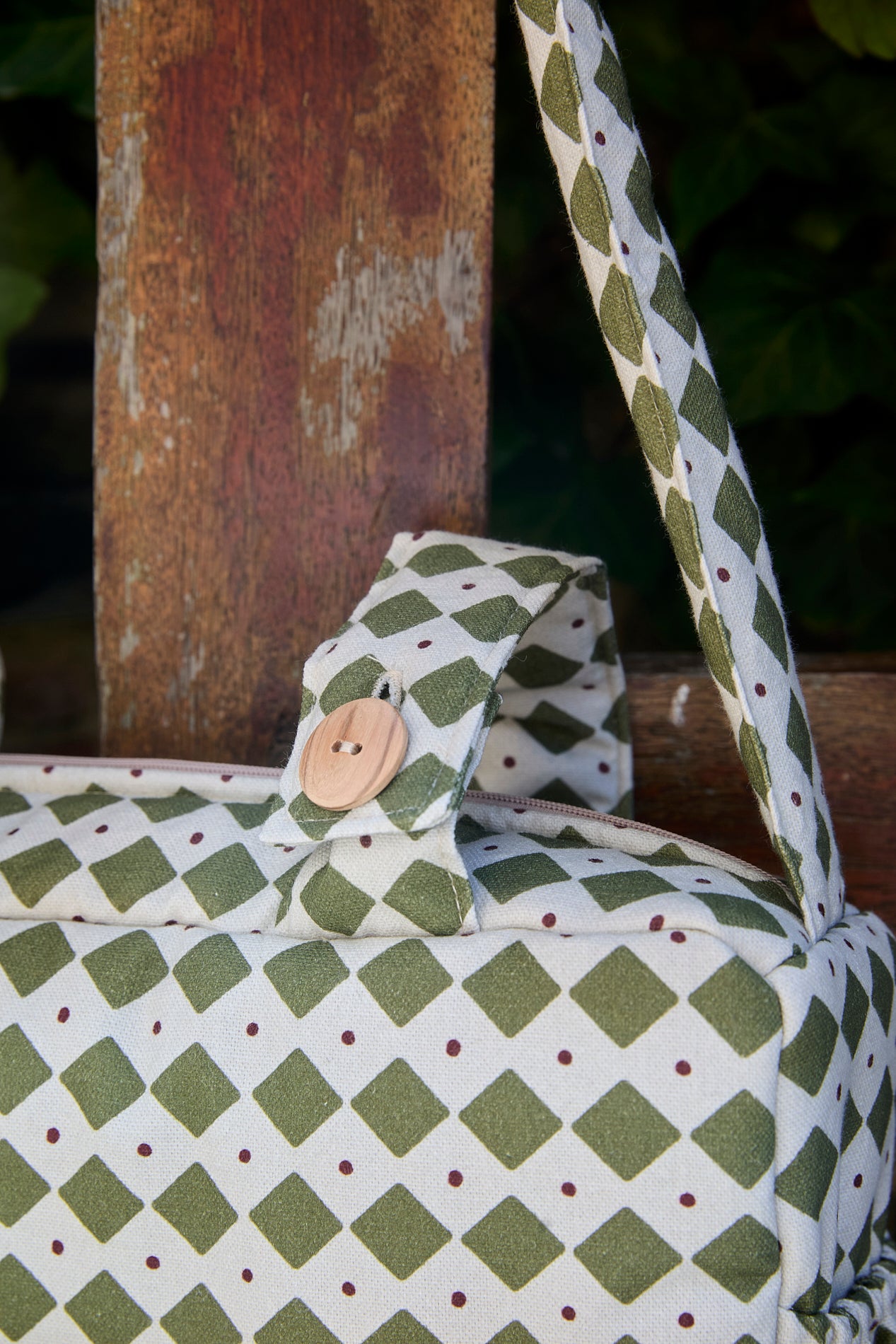 Se cierra con cremallera para evitar que el interior esté visible. Interior de loneta beige de rayas, material muy resistente y de fácil lavado. Bolsillos interiores a juego con la tela exterior.
