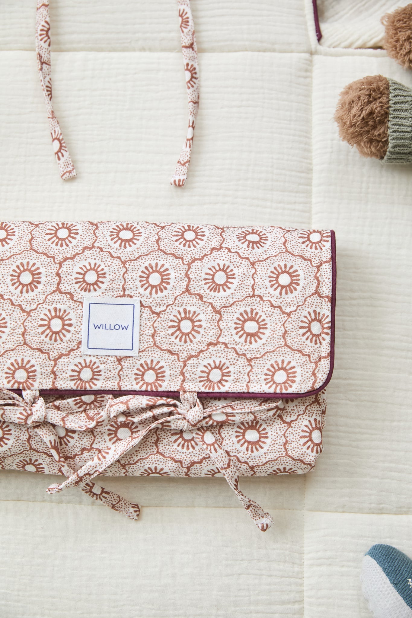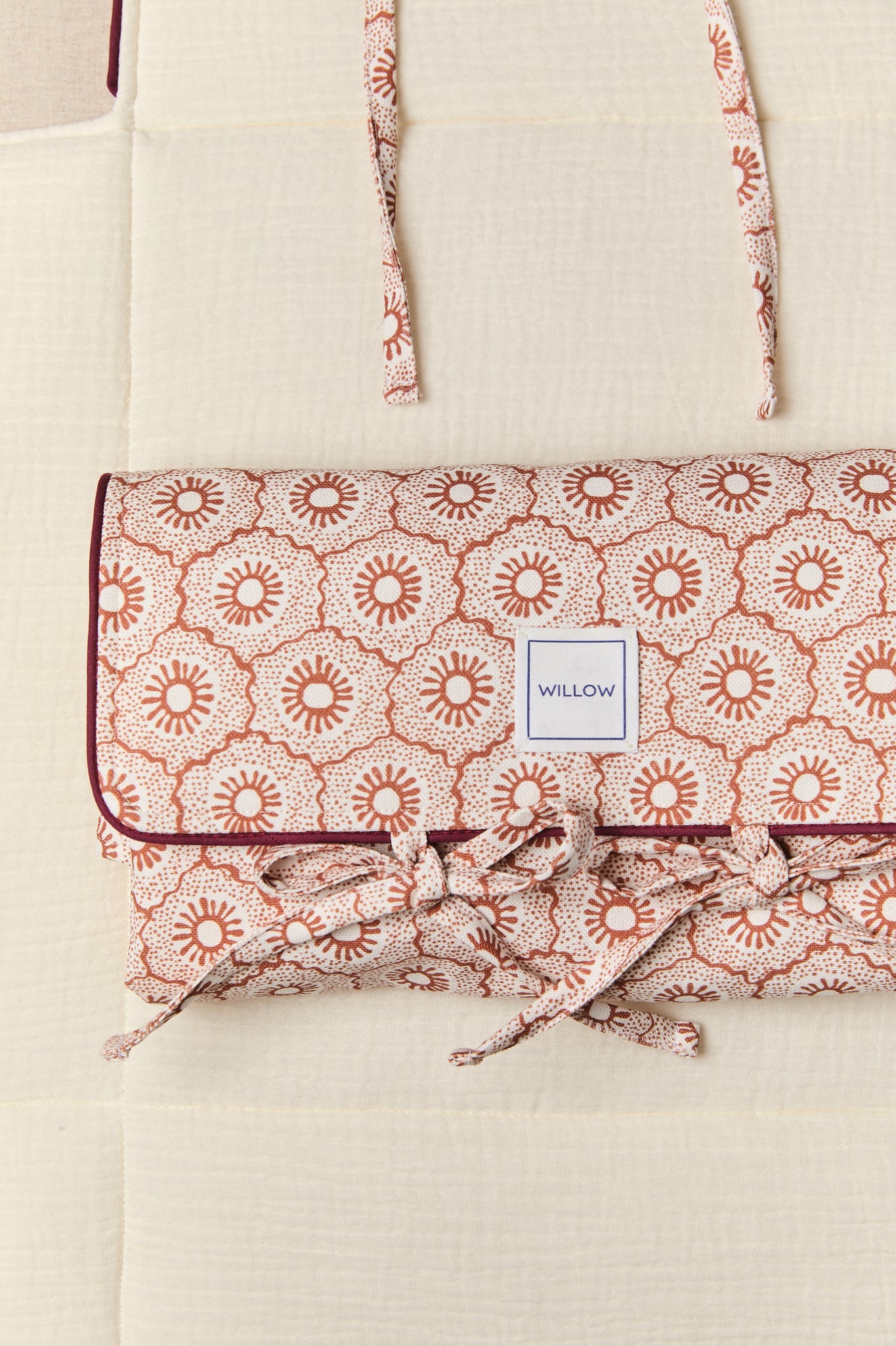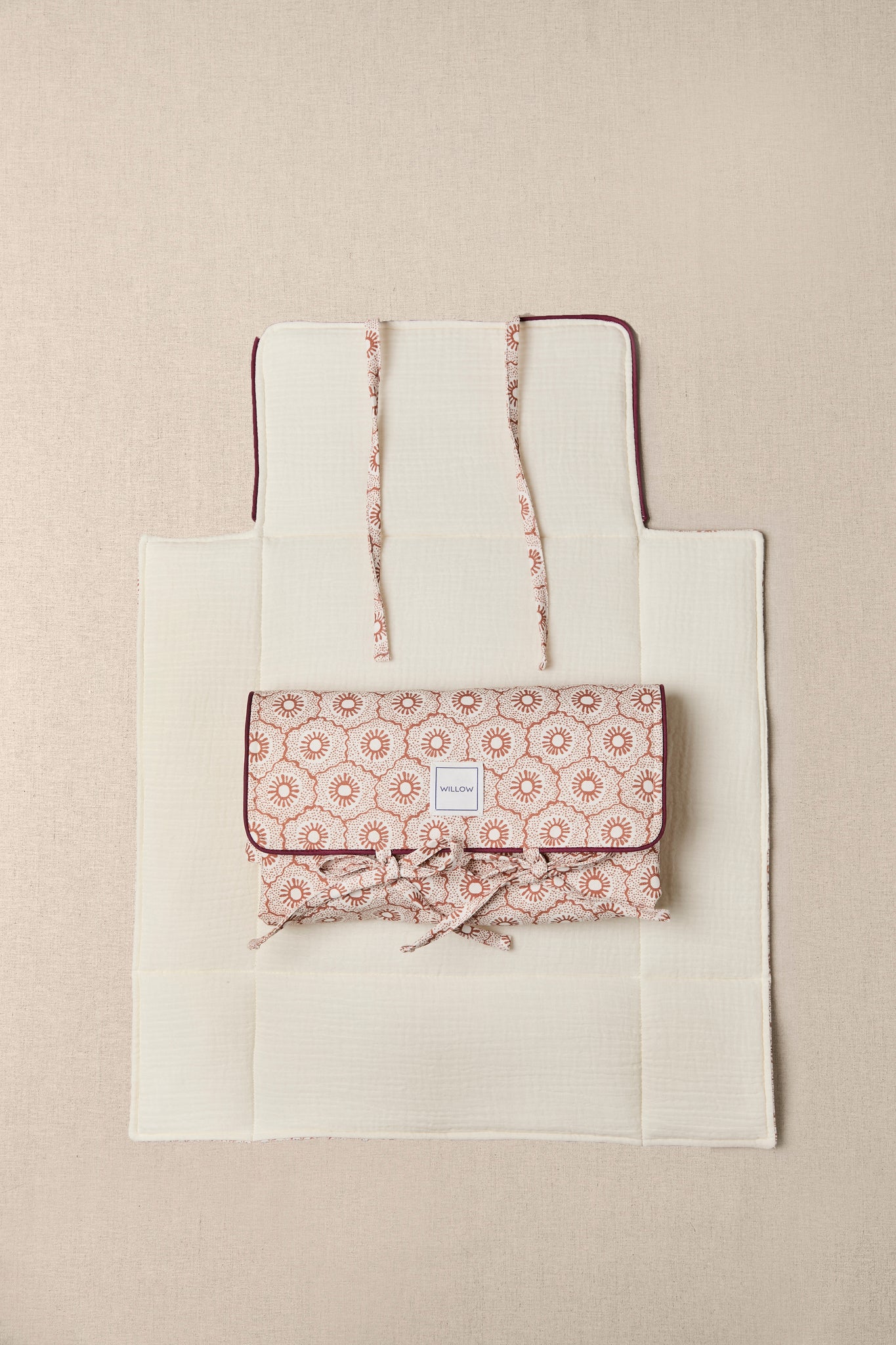 Cambiador de viaje fabricado con tejido 100% algodón en el exterior y bambula orgánica en el interior. Con una capa intermedia impermeable.