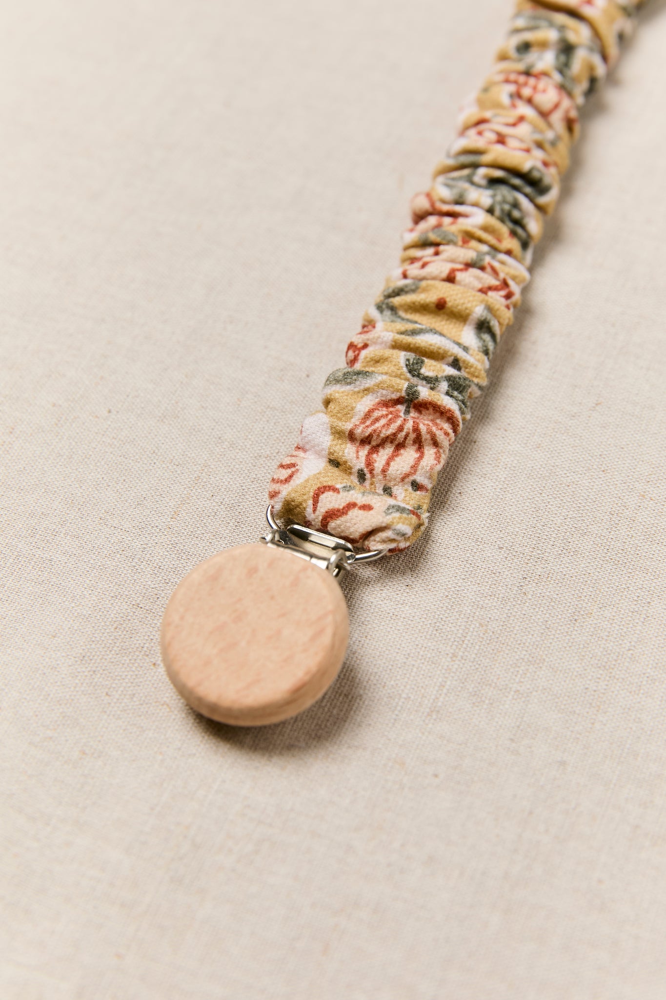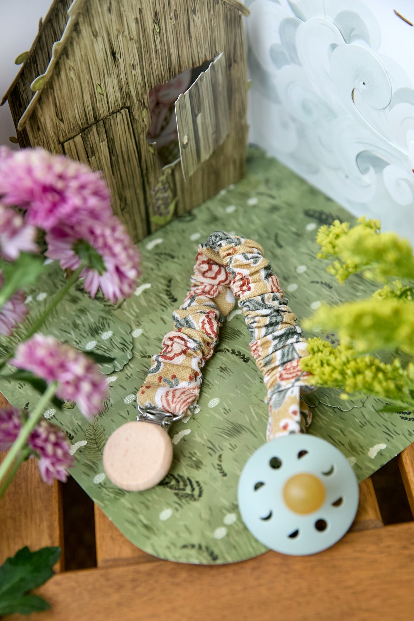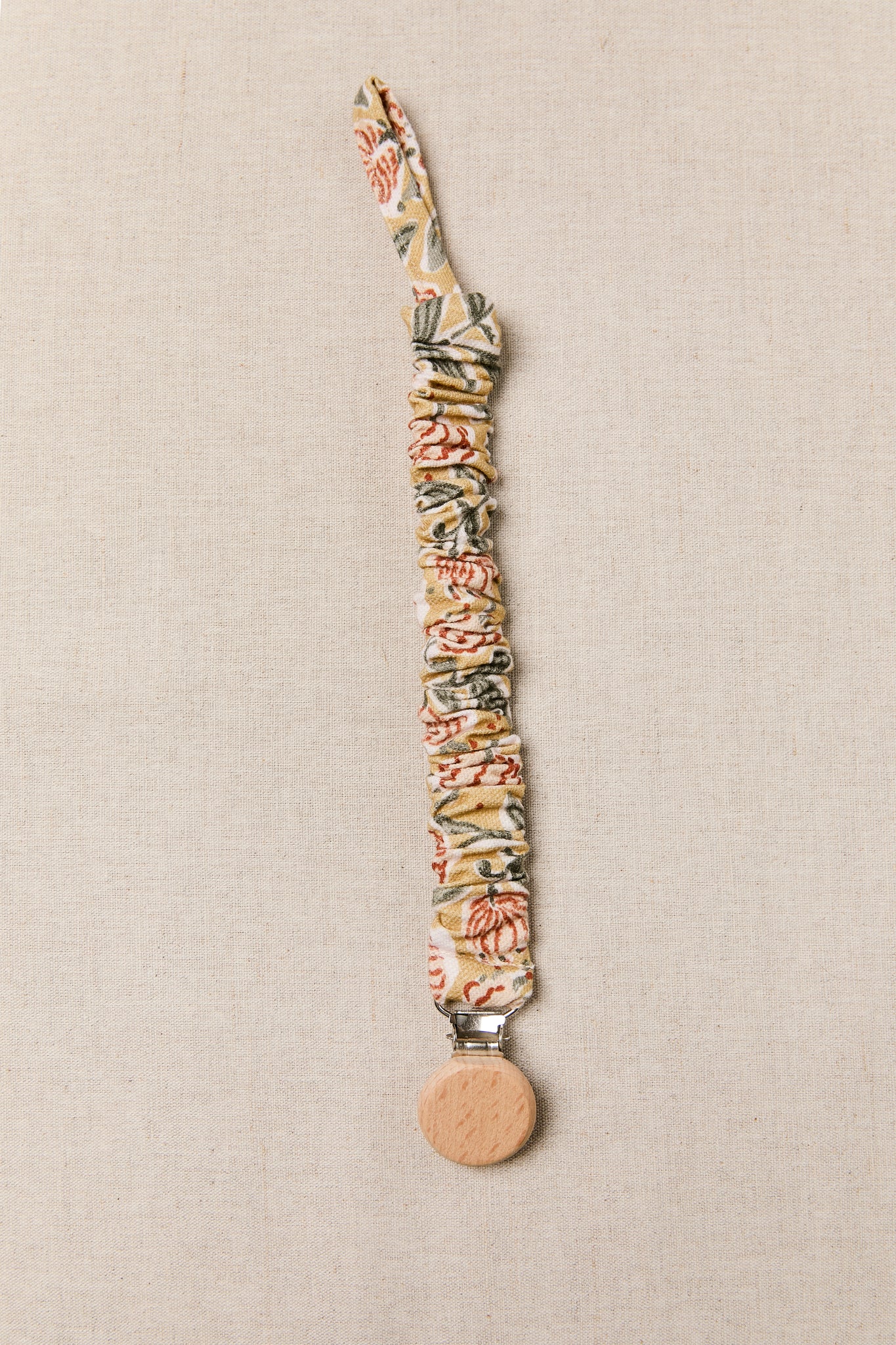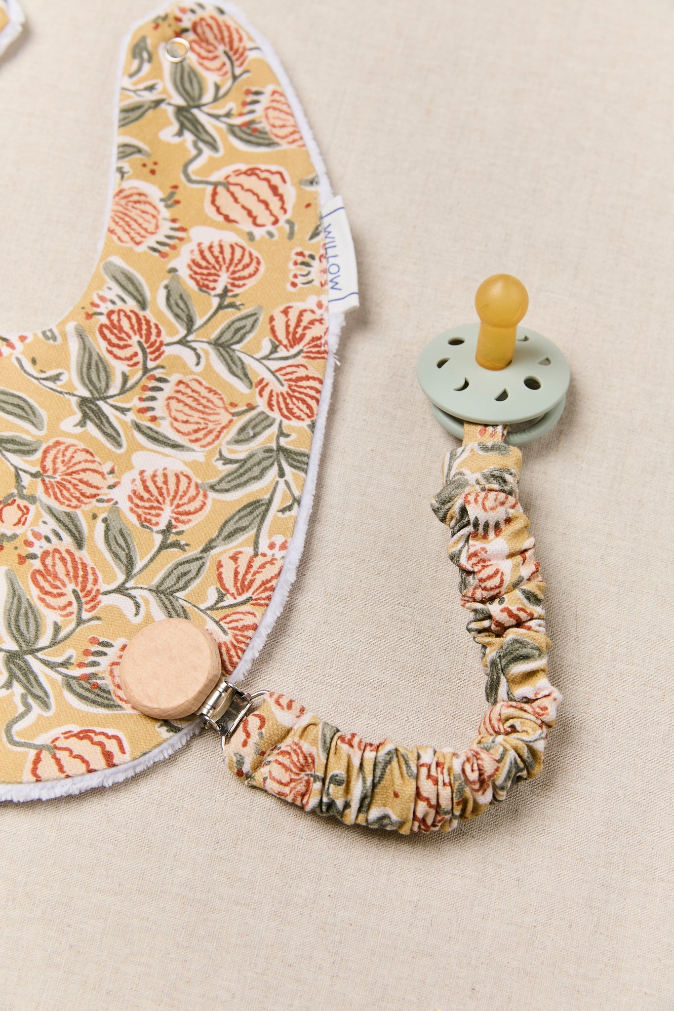 Chupetero con goma muy práctico y facil de colocar gracias a la pinza a presión con la que se enganchan. Cuenta con una tira de algodón de la misma tela que el chupetero para enganchar el chupete.