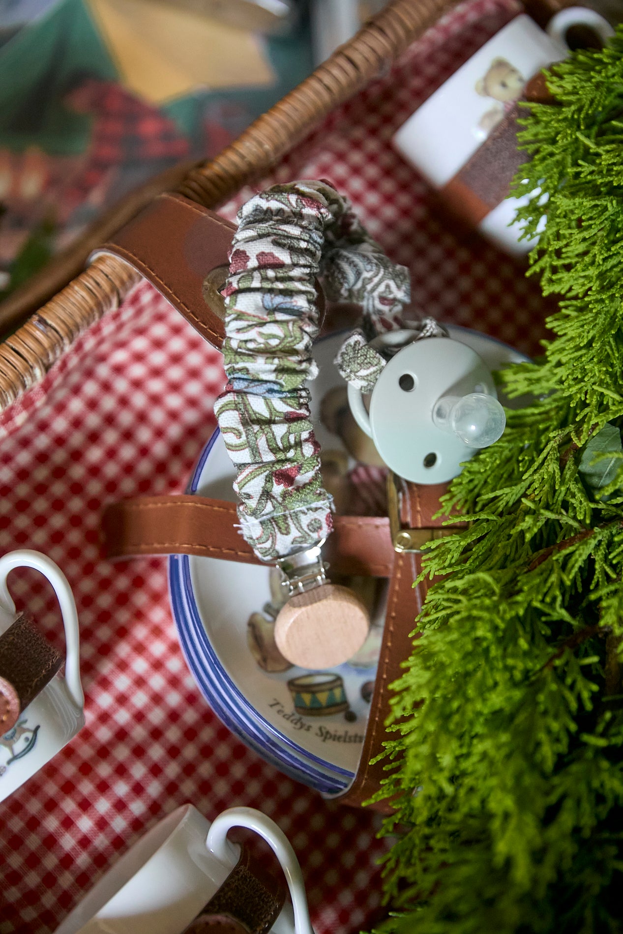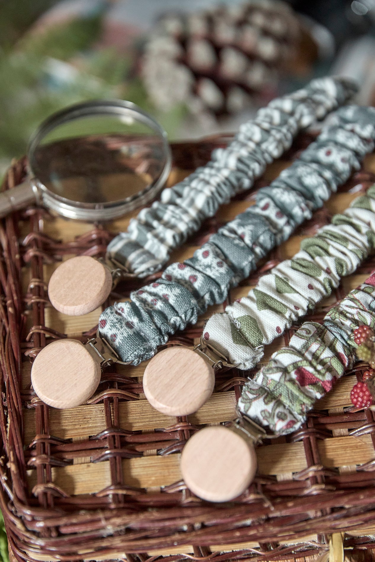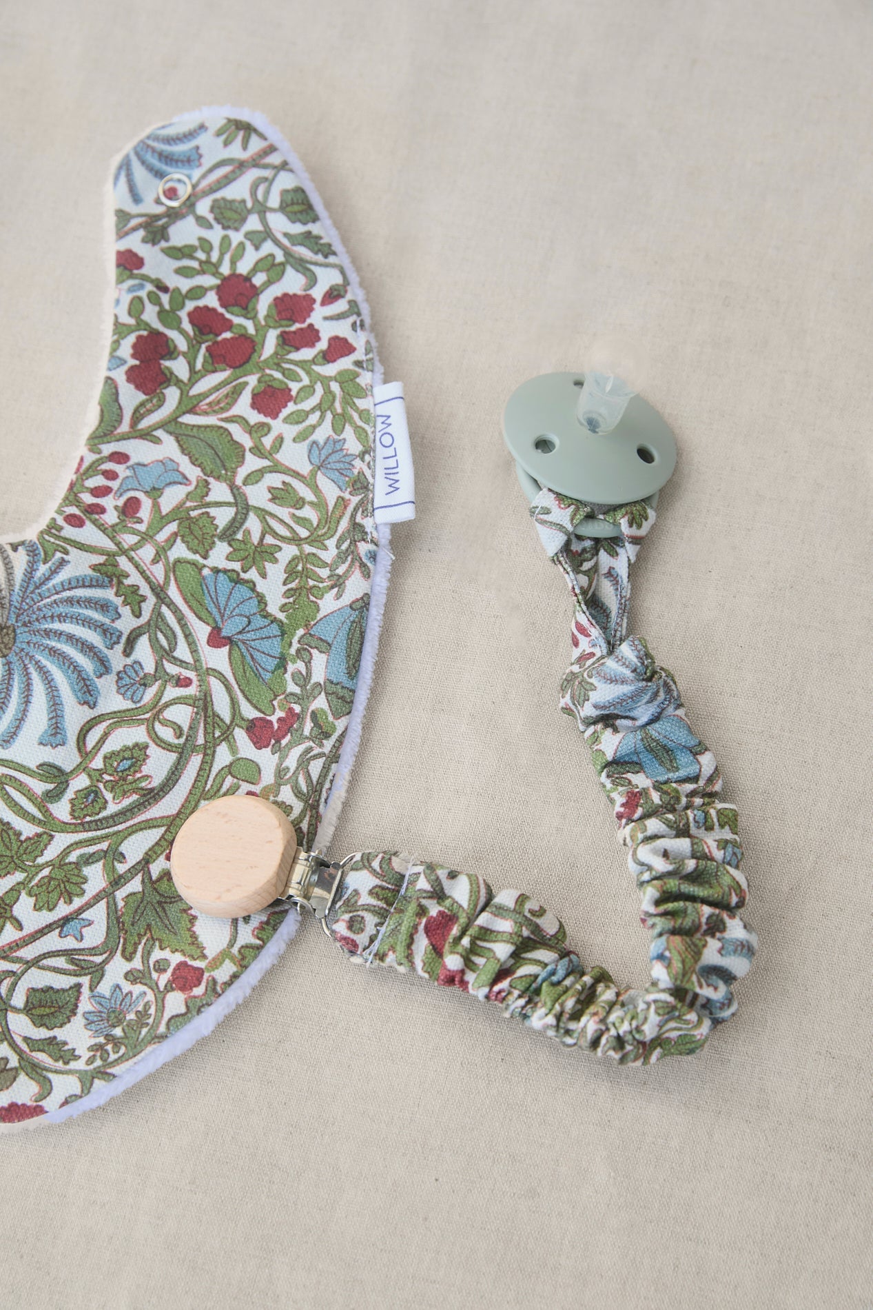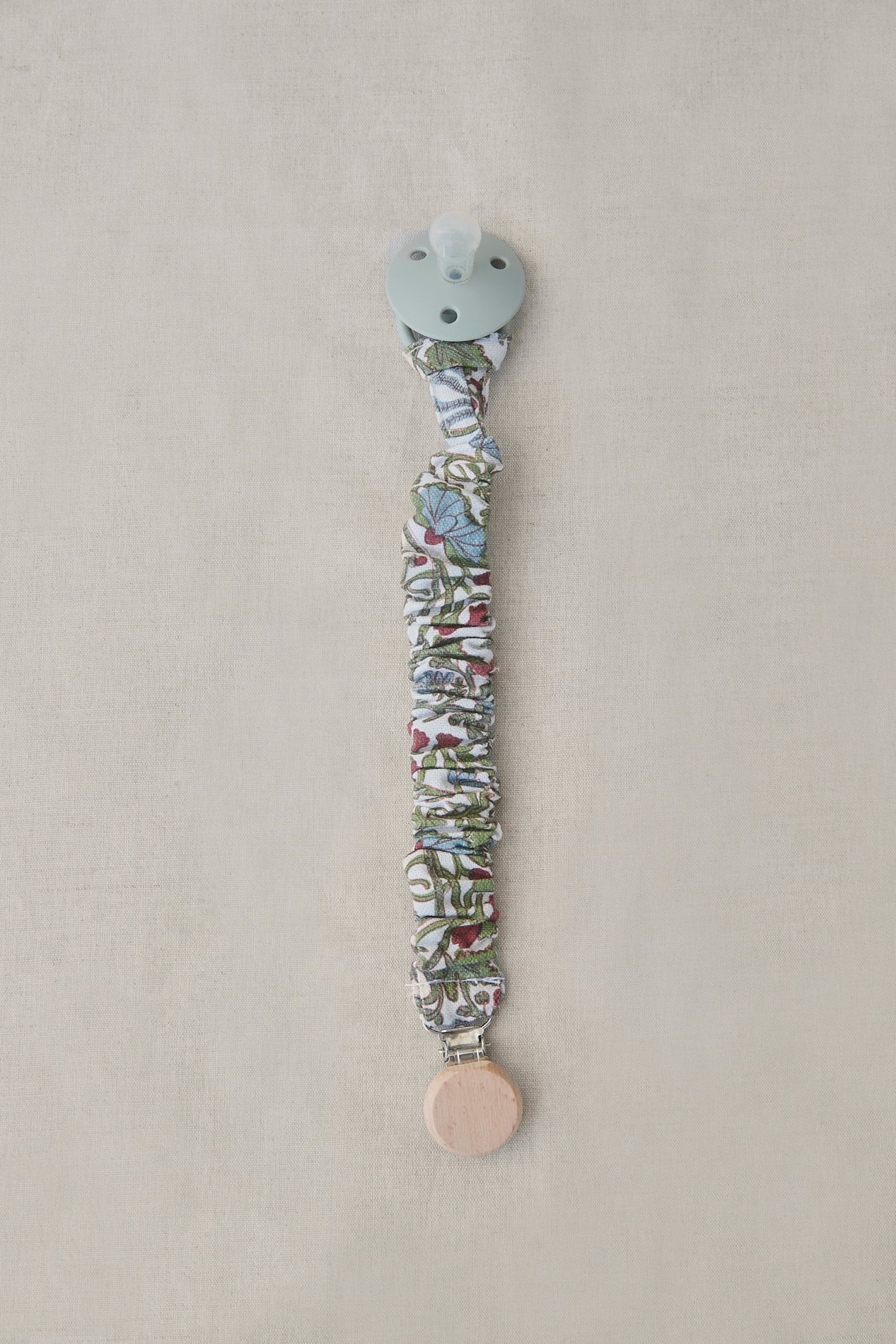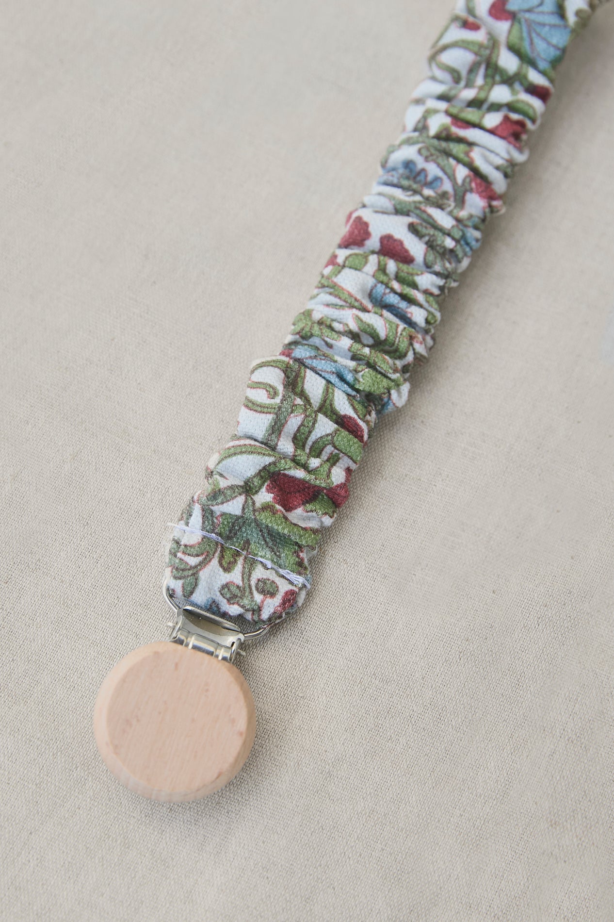 Chupetero con goma muy práctico y facil de colocar gracias a la pinza a presión con la que se enganchan. Cuenta con una tira de algodón de la misma tela que el chupetero para enganchar el chupete.