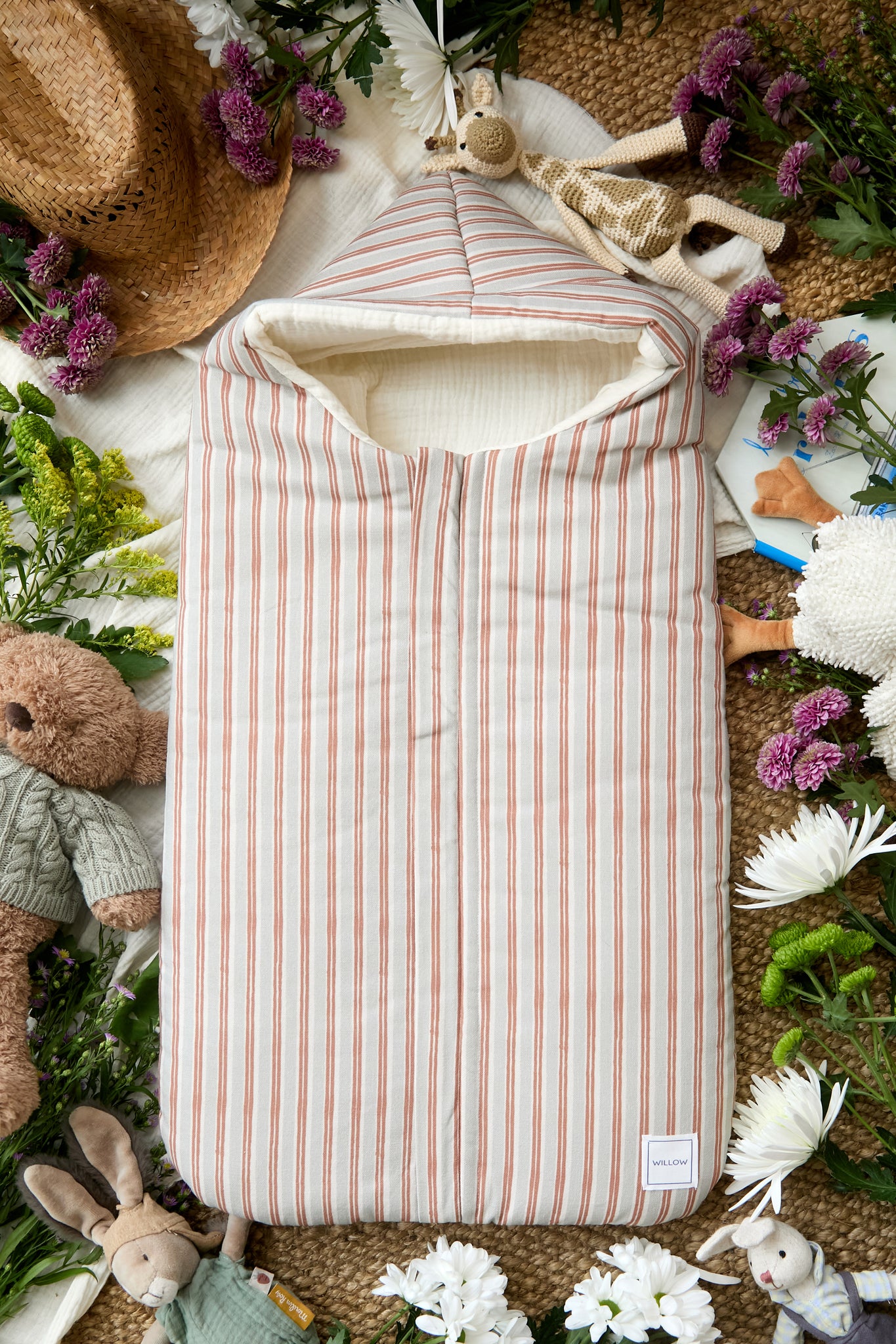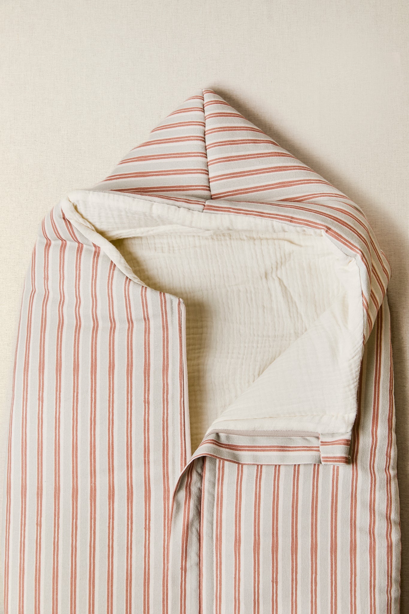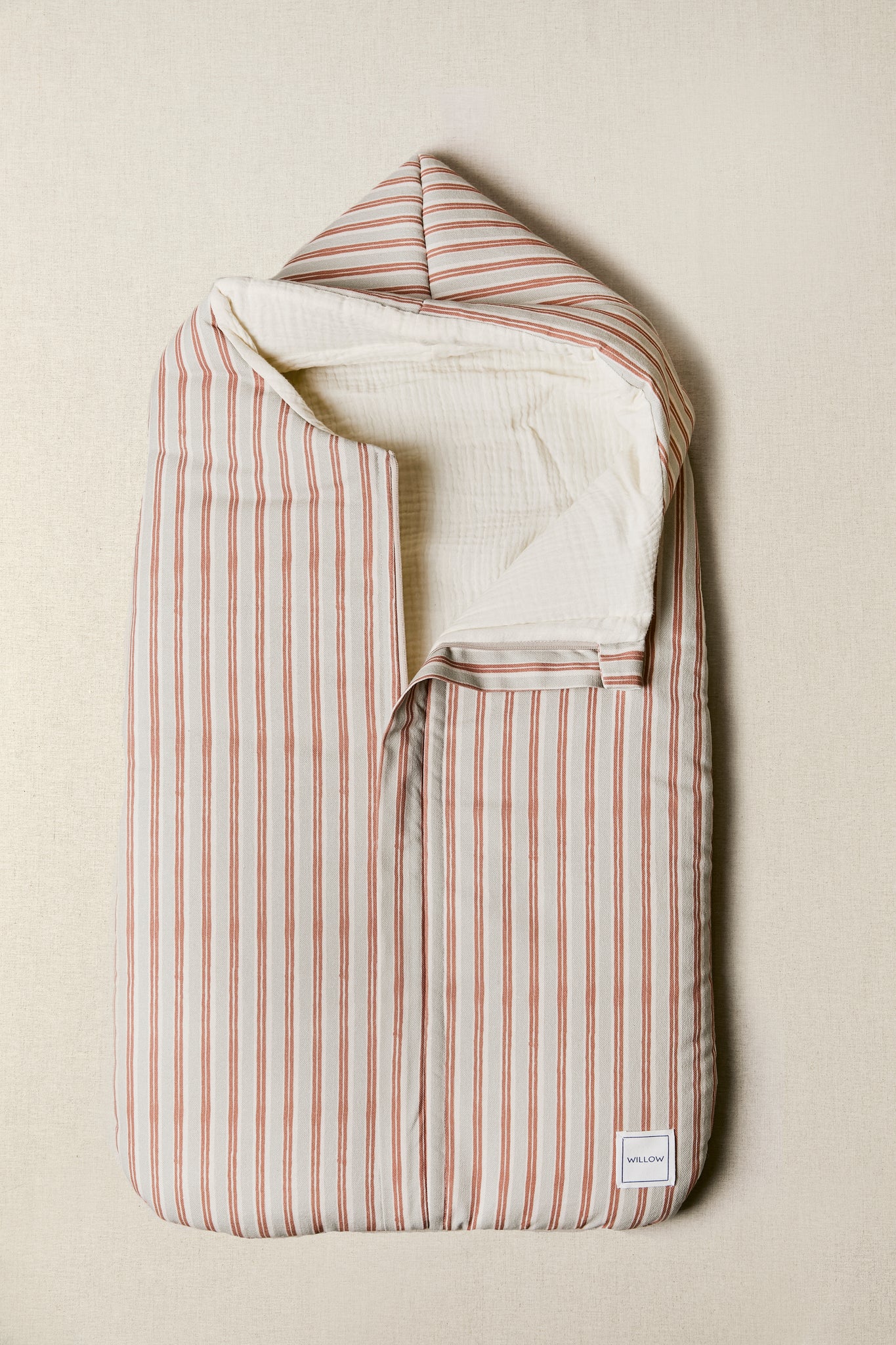 Saco de capazo de entretiempo elaborado con tejidos 100% algodón en el exterior y bambula orgánica en el interior. Relleno efecto pluma muy agradable al tacto.