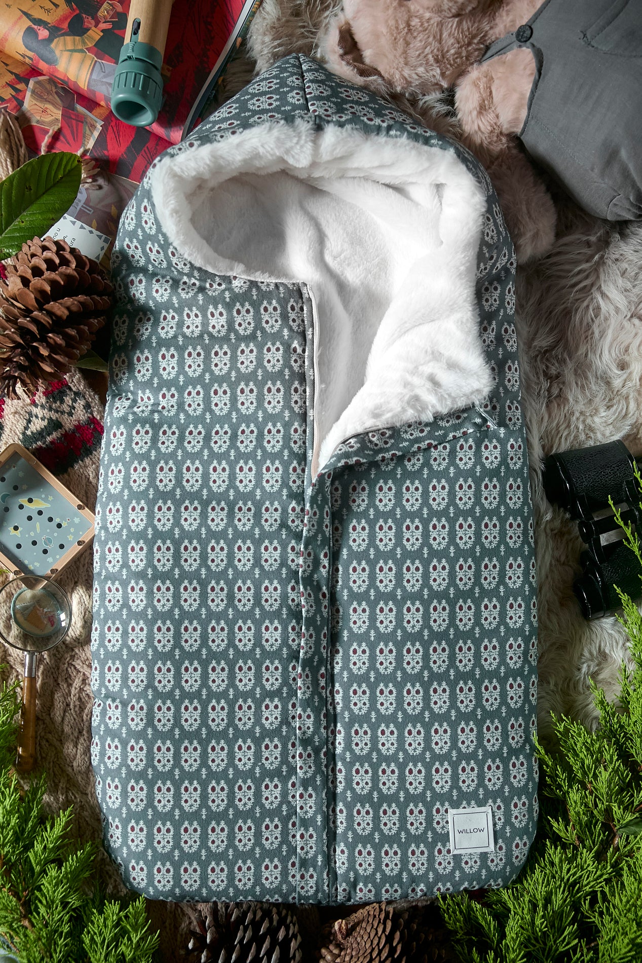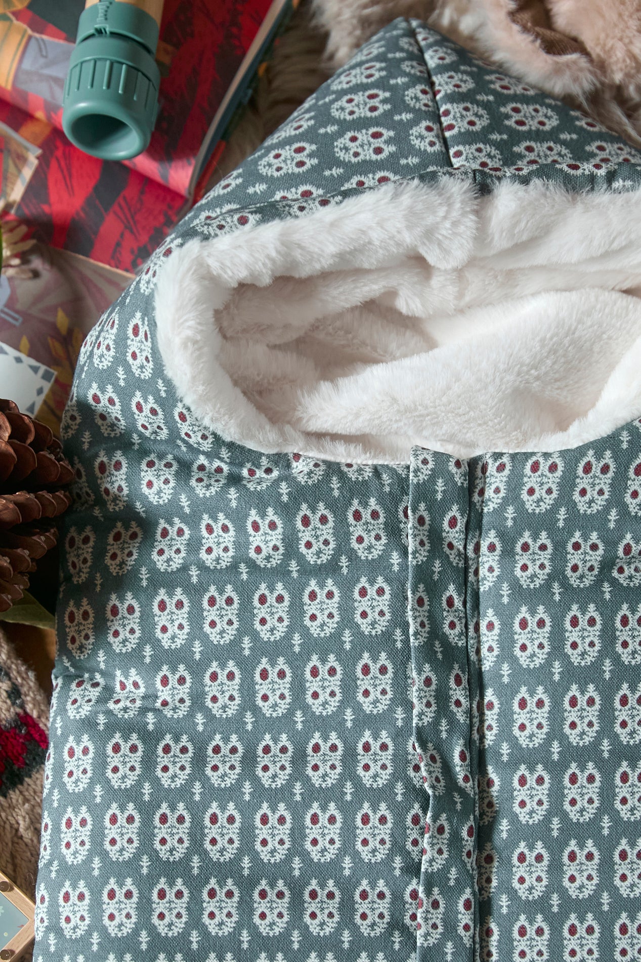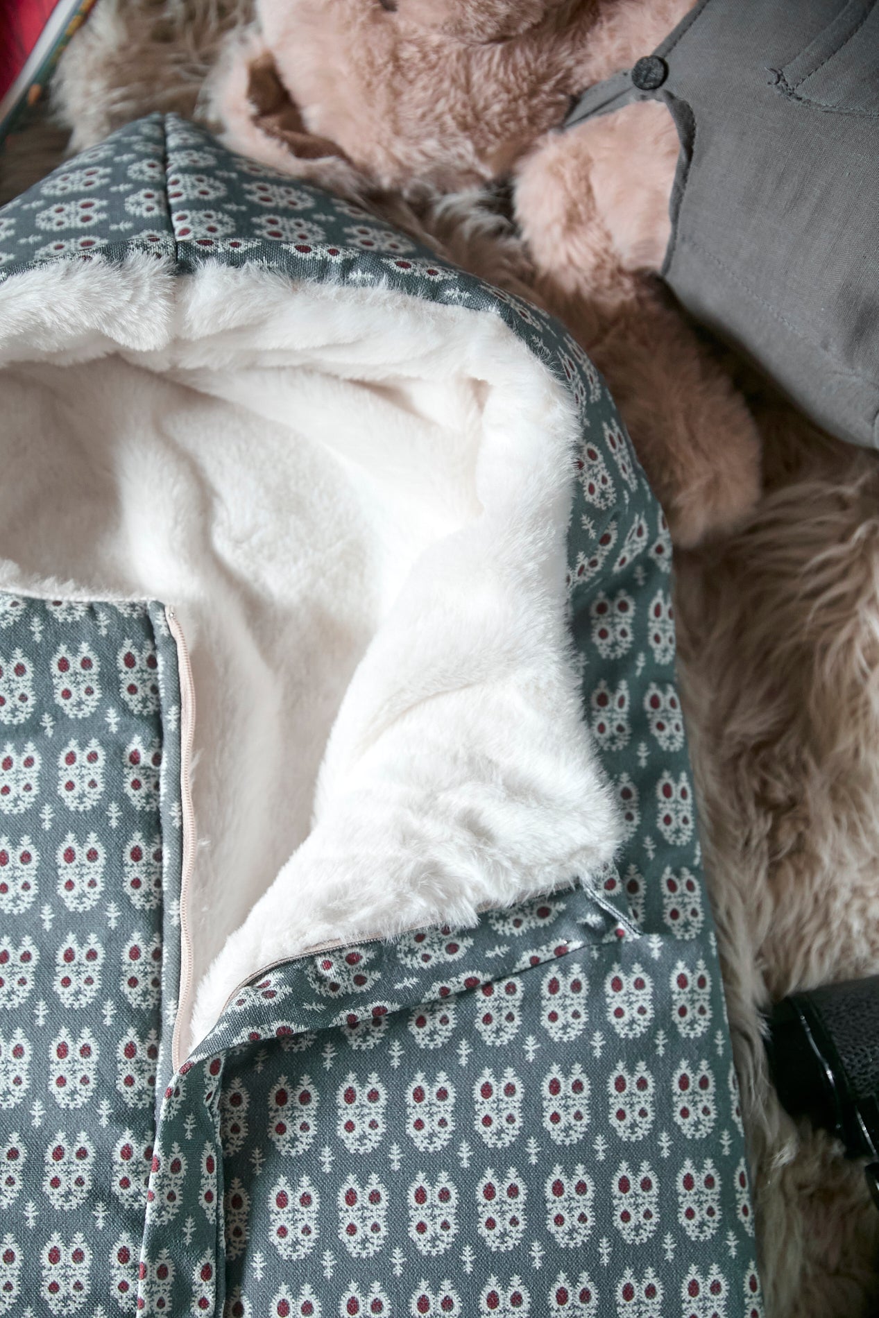 Elaborado con tejidos 100% algodón en el exterior y borreguito en el interior. Relleno efecto pluma, muy agradable al tacto.